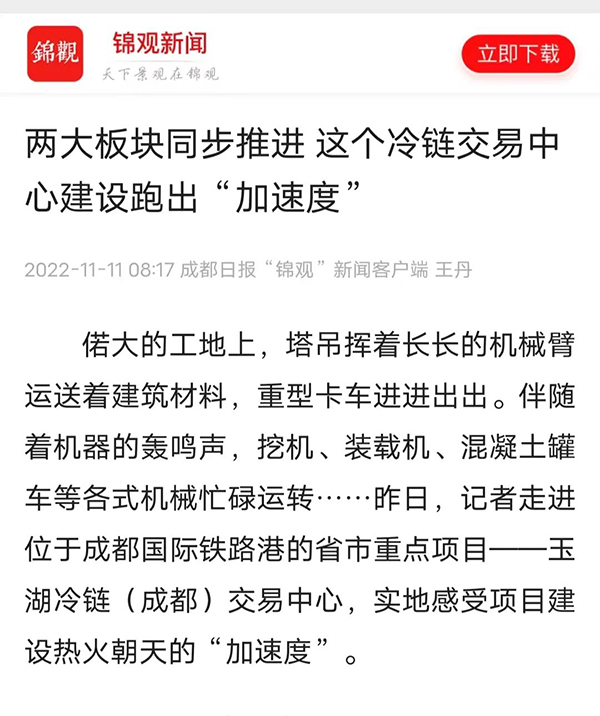全力以赴抓建设,稳住经济基本盘。近期,成都日报推出「拼经济搞建设抓发展」专栏,关注重点项目进展。11月11日,该栏目报道了探花国产在线观看冷链(成都)交易中心项目建设情况,四川国产精品探花在线网等转载,引起广泛关注。