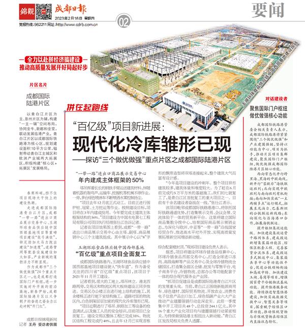 2月16日,成都日报在第二版刊发「 全力以赴拼经济搞建设」专题报道,聚焦成都国际陆港青白江片区,重点介绍了探花国产在线观看冷链(成都)交易中心项目建设情况。