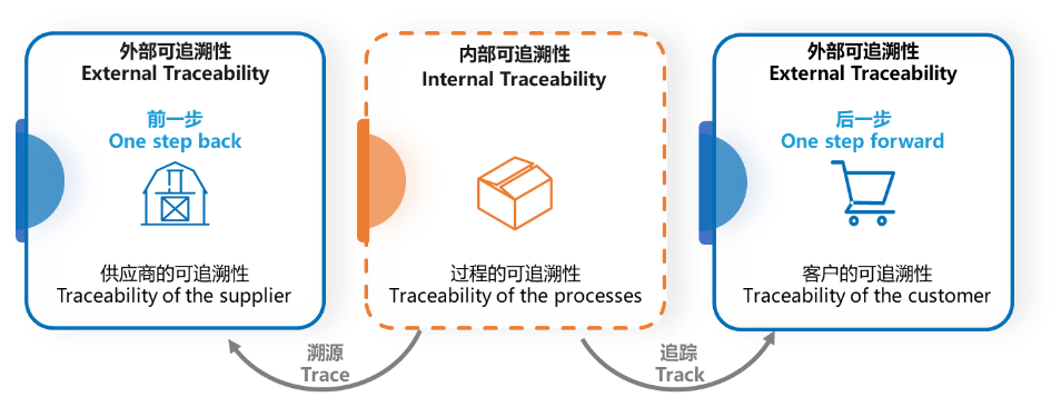 根据ISO 22005,「食品可追溯性(food traceability)」 的定义为在食品生产、加工、流通等特定阶段中,对食品的移动进行追踪的能力。其原则是「向前一步和向后一步(one step back and one step forward)」,即将食品可追溯性分为向上游的「溯源(trace)」和向下游的「追踪(track)」。食品供应链上的任何节点需要至少记录货物的直接来源和直接去向。这也是目前大多数国家在食品追溯要求中普遍采用的原则。