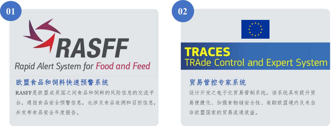 在追溯平台的建设方面,欧盟建立了统一的食品和饲料快速预警系统(RASFF)、贸易管控专家系统(TRACES)。一旦发生食品安全,系统会向各国通报食品安全预警信息,追溯和召回问题食品。此外,欧盟各国还建立各类食品的专门追溯系统。如在疯牛病发生后建立牛及牛肉的追溯系统,新出生的牛都会佩戴代表身份证的耳标。还有法国的加工蔬菜、生鲜家禽;德国的鸡蛋、肉类、鱼类;荷兰的奶制品、禽蛋;丹麦的猪肉;波兰的鱼类、沙拉类等。