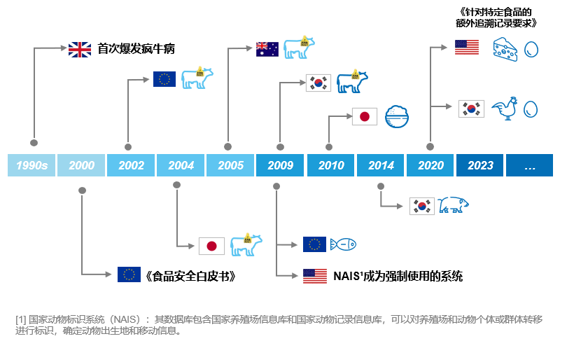 1990年代,牛脑海绵状病变(俗称疯牛病)在英国爆发并蔓延到欧洲及世界各地,引发全球范围恐慌。此后,随着沙门氏菌污染、口蹄疫、禽流感、三聚氰胺、苏丹红等食品安全事件的不断出现,国际层面及各国政府对食品可追溯性系统(Food Traceability System,又称食品追溯系统)的研究、建设和推广逐渐升温。
