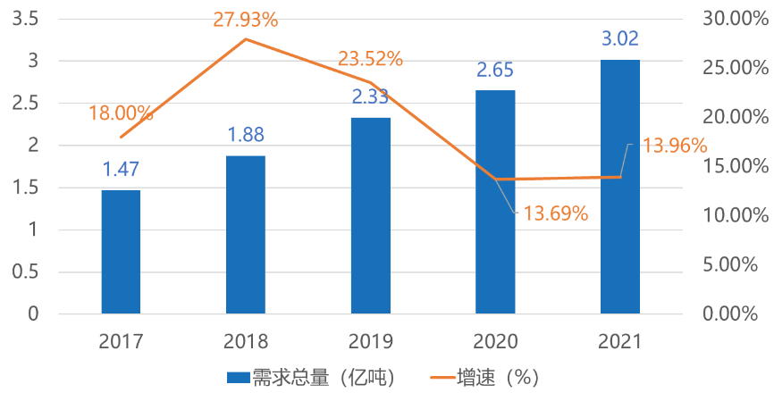 图7. 2017-2021年我国食品冷链探花视频在线播放需求总量及增速(数据来源:中物联冷链委)