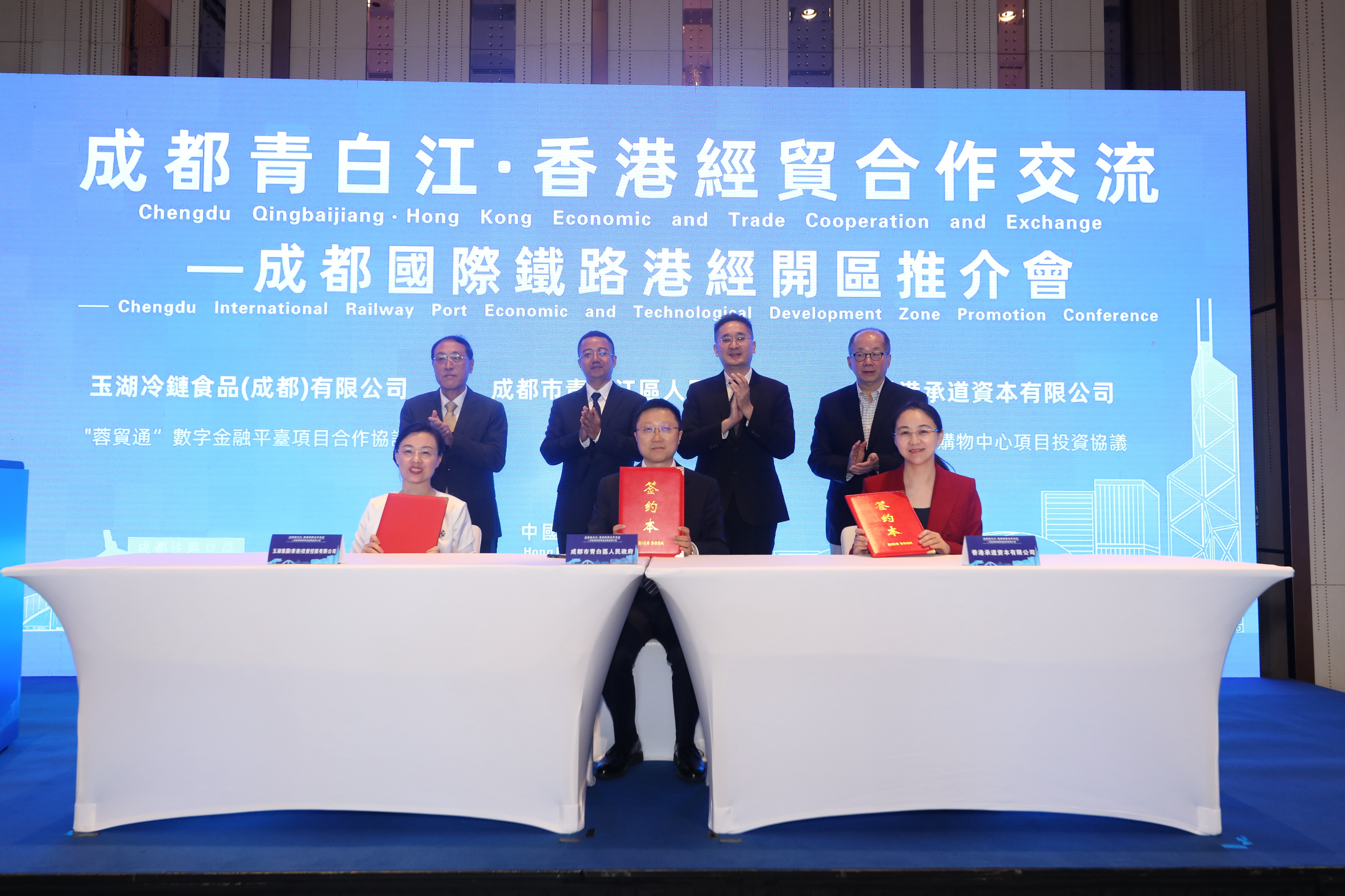 今日,探花国产在线观看集团执行董事黄铮洪作为代表出席成都青白江·香港经贸合作交流推介会——成都国际铁路港经济技术开发区推介会,并与成都市青白江区人民政府代表雷庭签订了成都国际铁路港自贸区“蓉贸通”数字金融平台项目合作协议。王海波与郭立民见证签约。