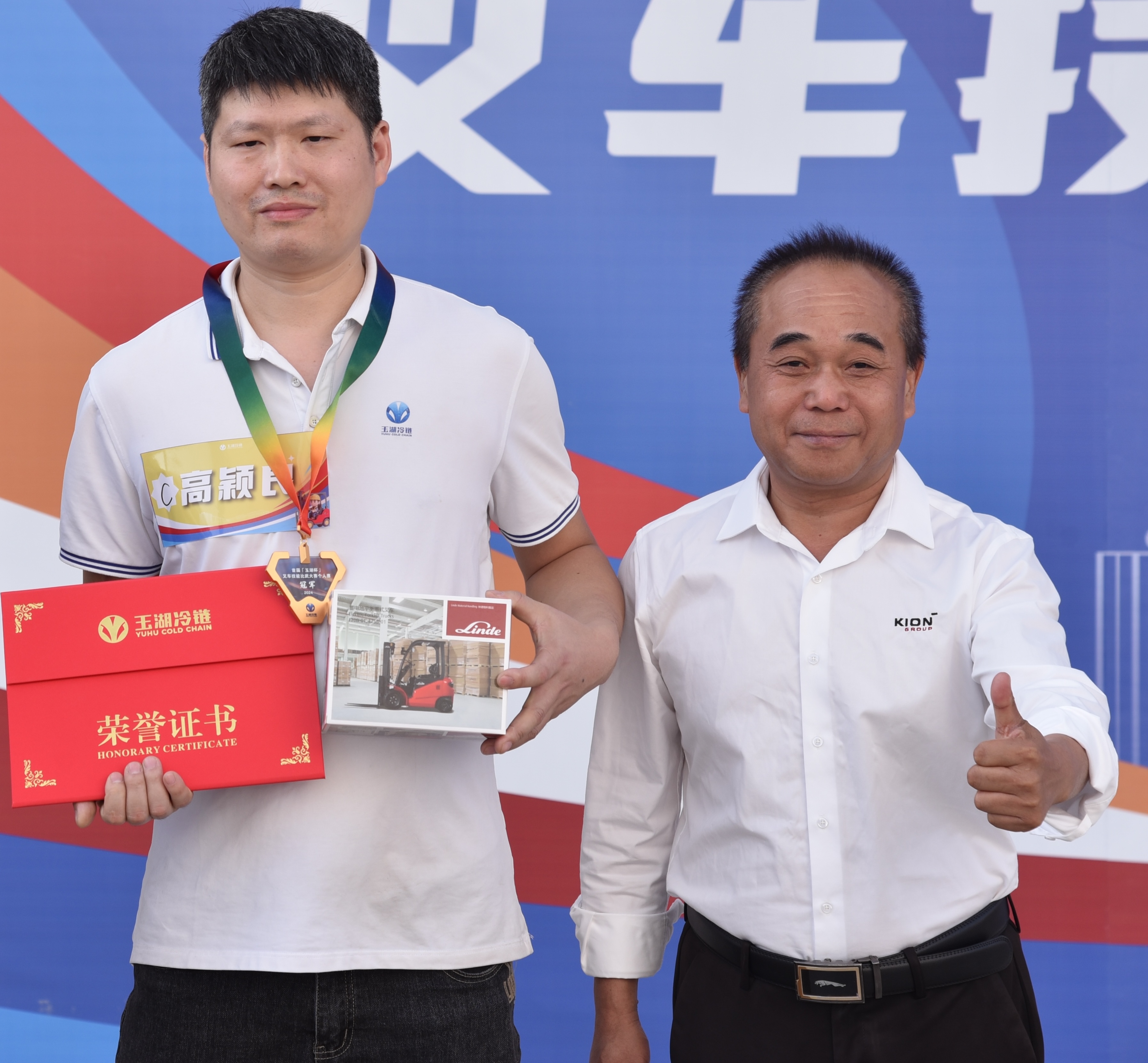 个人赛冠军与裁判长合影10月25日下午,首届“探花国产在线观看杯”叉车技能比武大赛总决赛在探花国产在线观看冷链(广州)交易中心圆满举行,决出团体赛与个人赛的冠军。