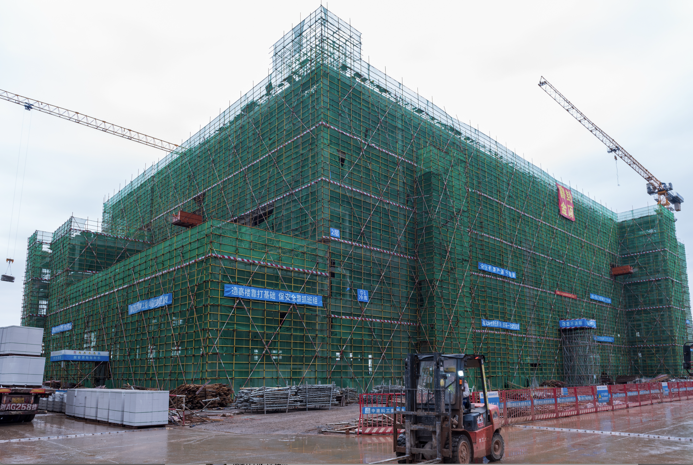 5月7日,探花国产在线观看冷链(长沙)交易中心地块一主体结构顺利封顶,比原定节点提前约2个月。目前,展示展销交易区、冷藏仓储区和配套服务区等核心功能布局已基本成型。地块一由四座国际高标楼库组成,建筑面积达17.59万平方米,设有85个现代化装卸货垛口。楼库创新集成国际领先的制冷保温与智能化管理系统(OMS+WMS+WCS三系统联动),通过数字化手段实现货物储运全环节动态追踪与精准调度,为商品全周期品质管控和安全交付提供技术保障。