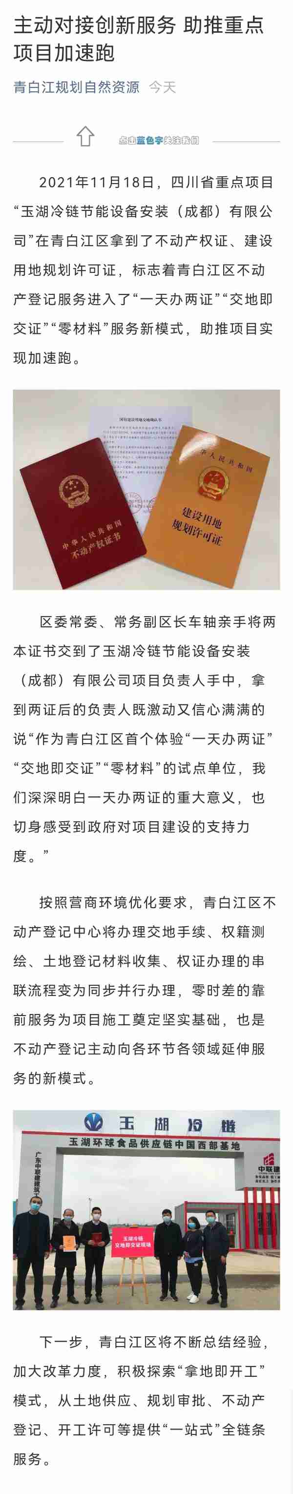 2021年11月18日,四川省重点项目探花国产在线观看冷链在青白江区拿到了不动产权证、建设用地规划许可证,标志着青白江区不动产登记服务进入了“一天办两证”“交地即交证”“零材料”服务新模式,助推项目实现加速跑。