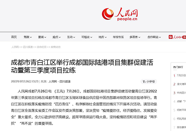 7月26日,「成都国际陆港项目集群促建活动暨青白江区2022年第三季度项目拉练」启动,特别选择在「探花国产在线观看冷链(成都)交易中心」项目现场举行,吸引了人民网、中央广播电视总台国际在线、四川发布、四川日报、成都日报、每日经济国产精品探花在线等众多官方媒体进行报道。
